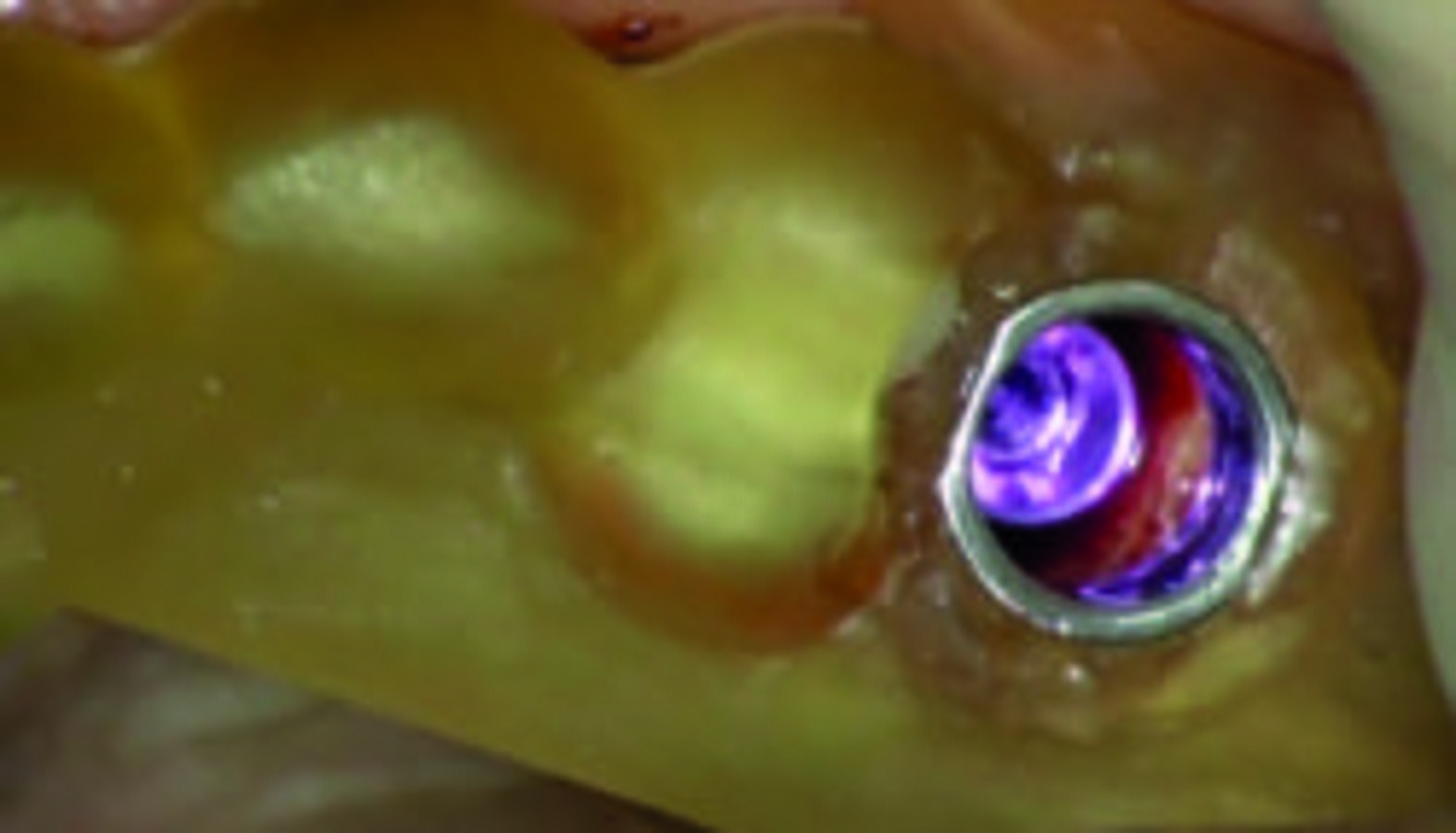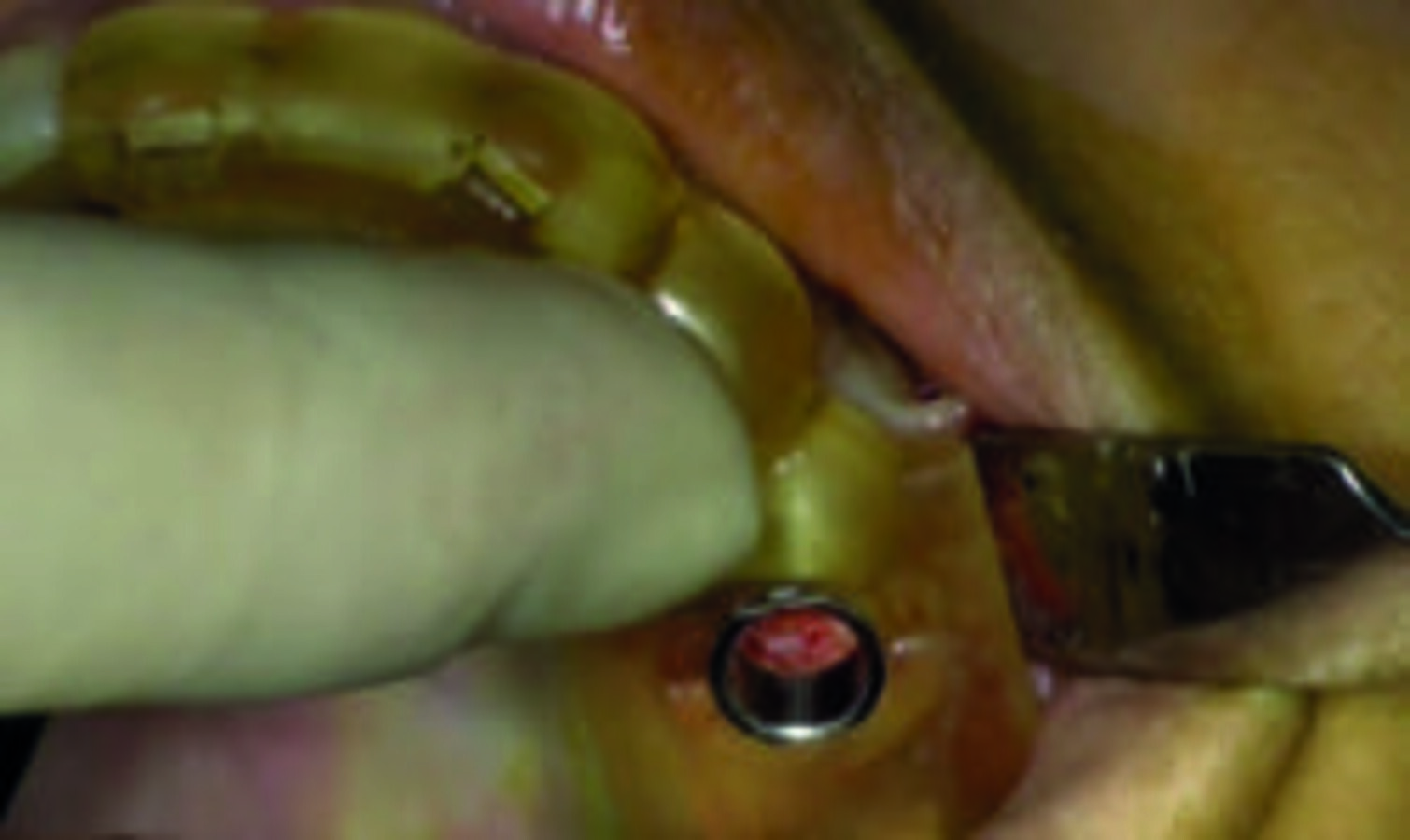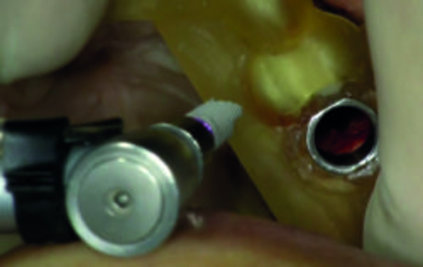Le site d’extraction est cureté minutieusement et désépithélialisé à l’aide d’une fraise boule diamantée, puis le guide chirurgical est remis en place.