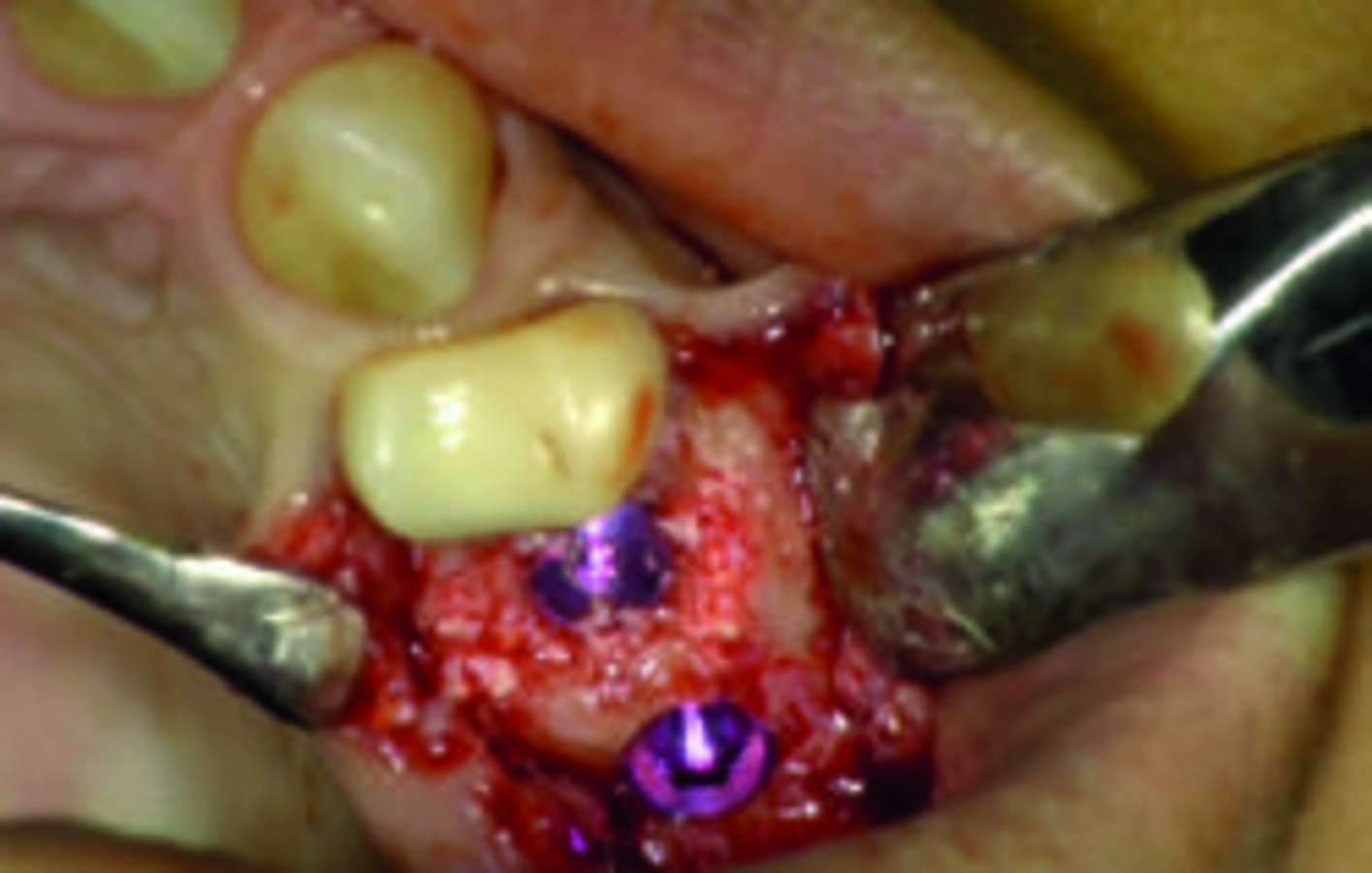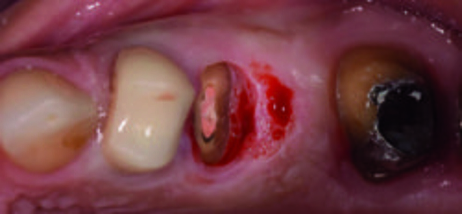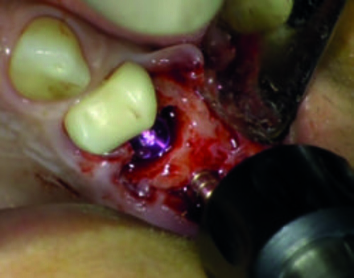 Le site d’extraction est cureté minutieusement et désépithélialisé à l’aide d’une fraise boule diamantée, puis le guide chirurgical est remis en place.
