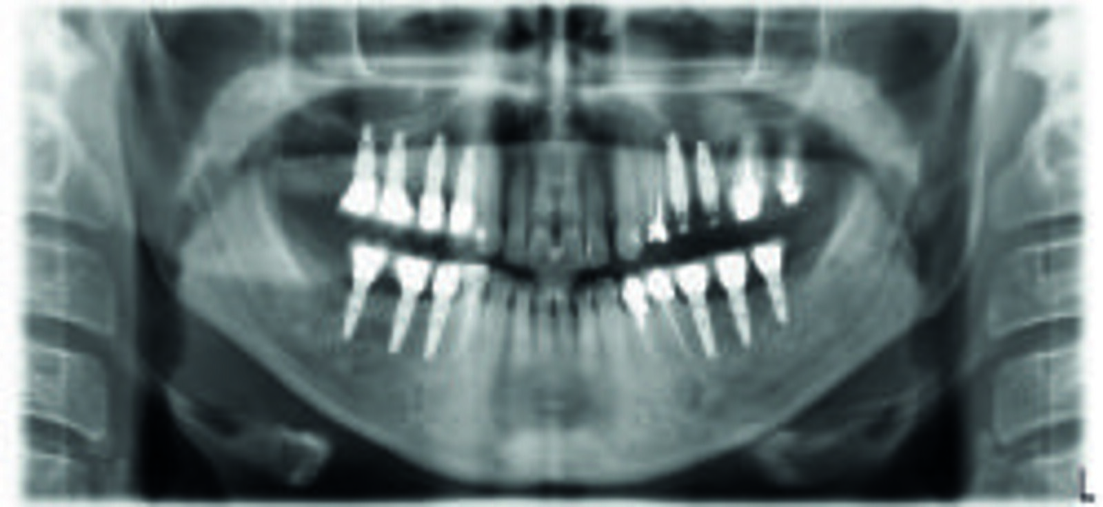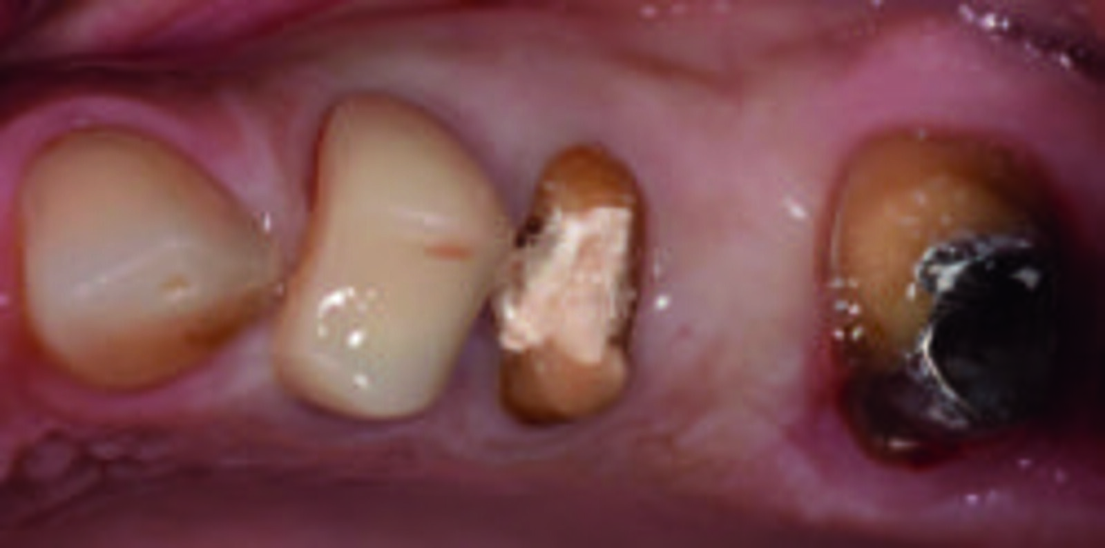 L’examen clinique et radiographique mettent en évidence l’impossibilité de reprendre le traitement de racine de la 25, compromettant son pronostic. Les dents 27 et 28 sont reprises endodontiquements, puis réalisation de faux-moignons et mise en place de provisoires avec une extension en 26.