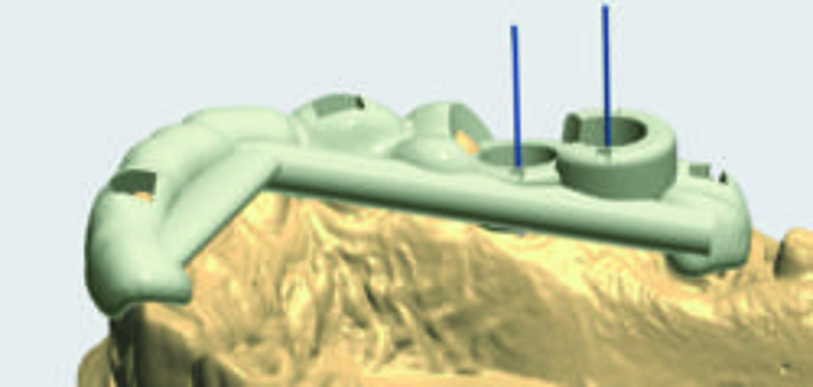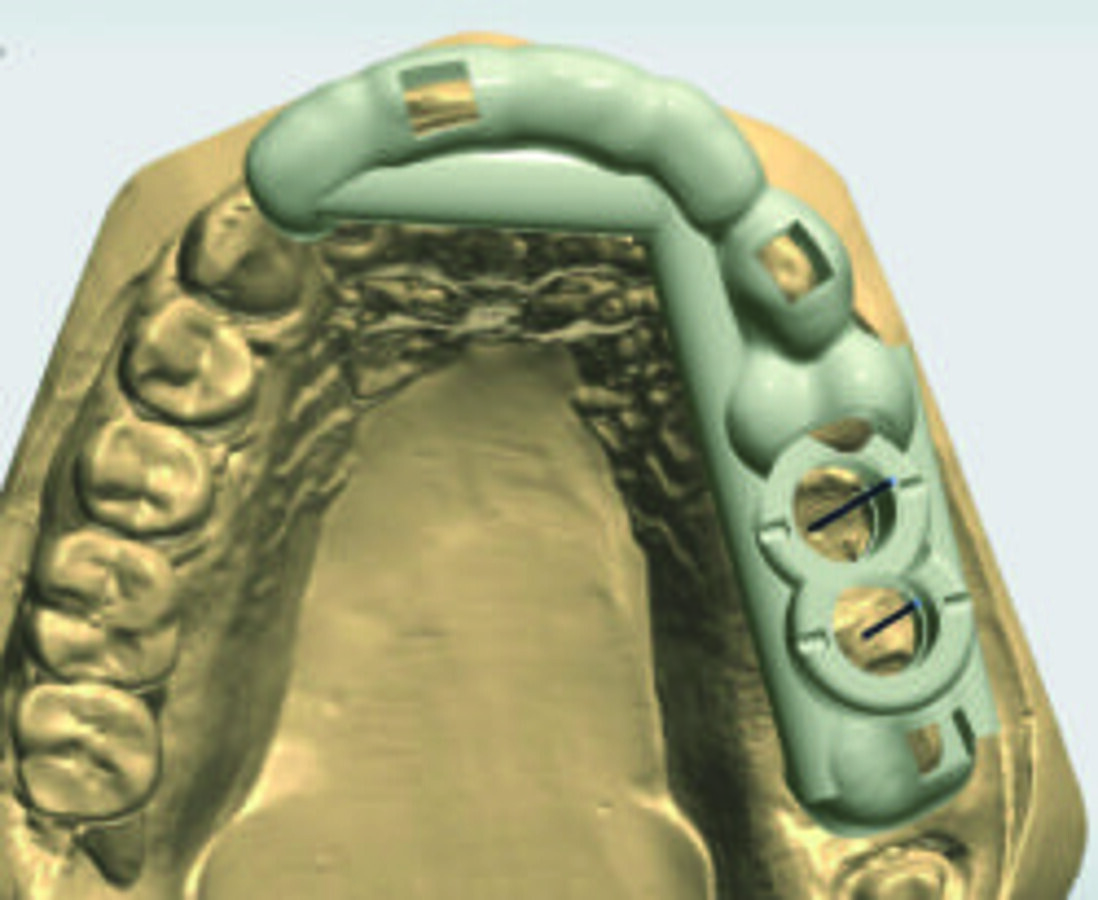 L’empreinte dentaire en silicone a été coulée puis le modèle en plâtre numérisé avec un scanner de table par le laboratoire Crown Ceram (Alsace) équipé en son sein d’un centre d’usinage de dernière génération. Grâce au logiciel d’implantologie Implant Studio de 3shape, nous avons pu visualiser la largeur et la hauteur de la crête édentée afin d’étudier la faisabilité du projet prothétique en collaboration étroite avec les prothésistes designers du laboratoire Crown Ceram.