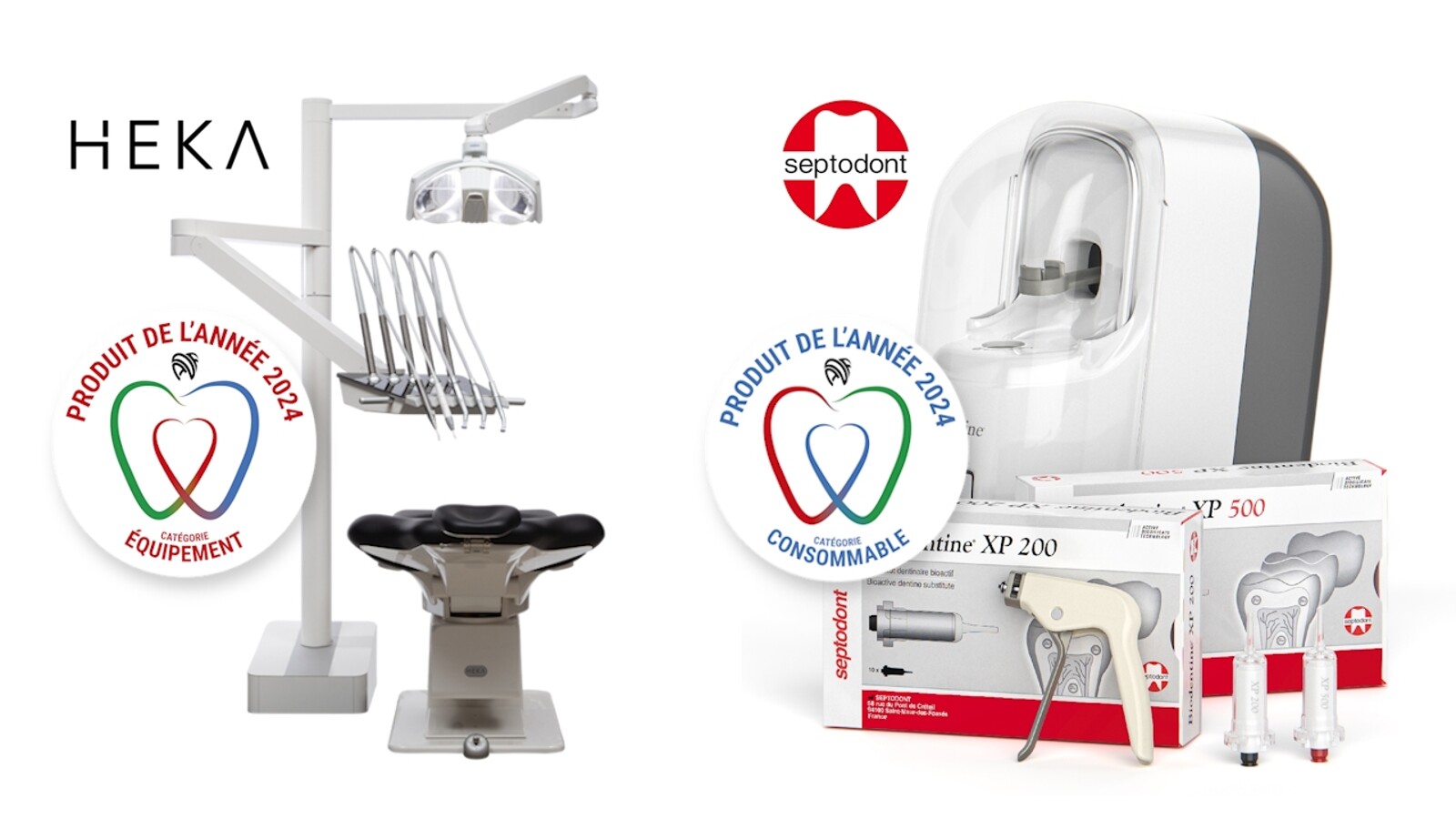 Les deux produits de l'année 2024 sont : Heka I+ de Heka Dental dans la catégorie équipement et la nouvelle version de Biodentine XP de Septodont dans la catégorie consommables. (Photo : ADF)