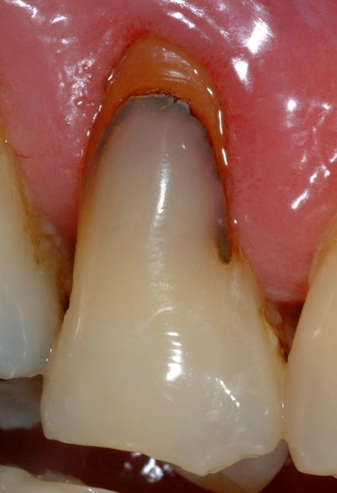 Fig. 1 : Les racines exposées sont prédisposées au risque carieux ; elles se déminéralisent plus tôt et plus rapidement, car la dentine ou le cément n’est pas protégé par l’émail ou l’alvéole.