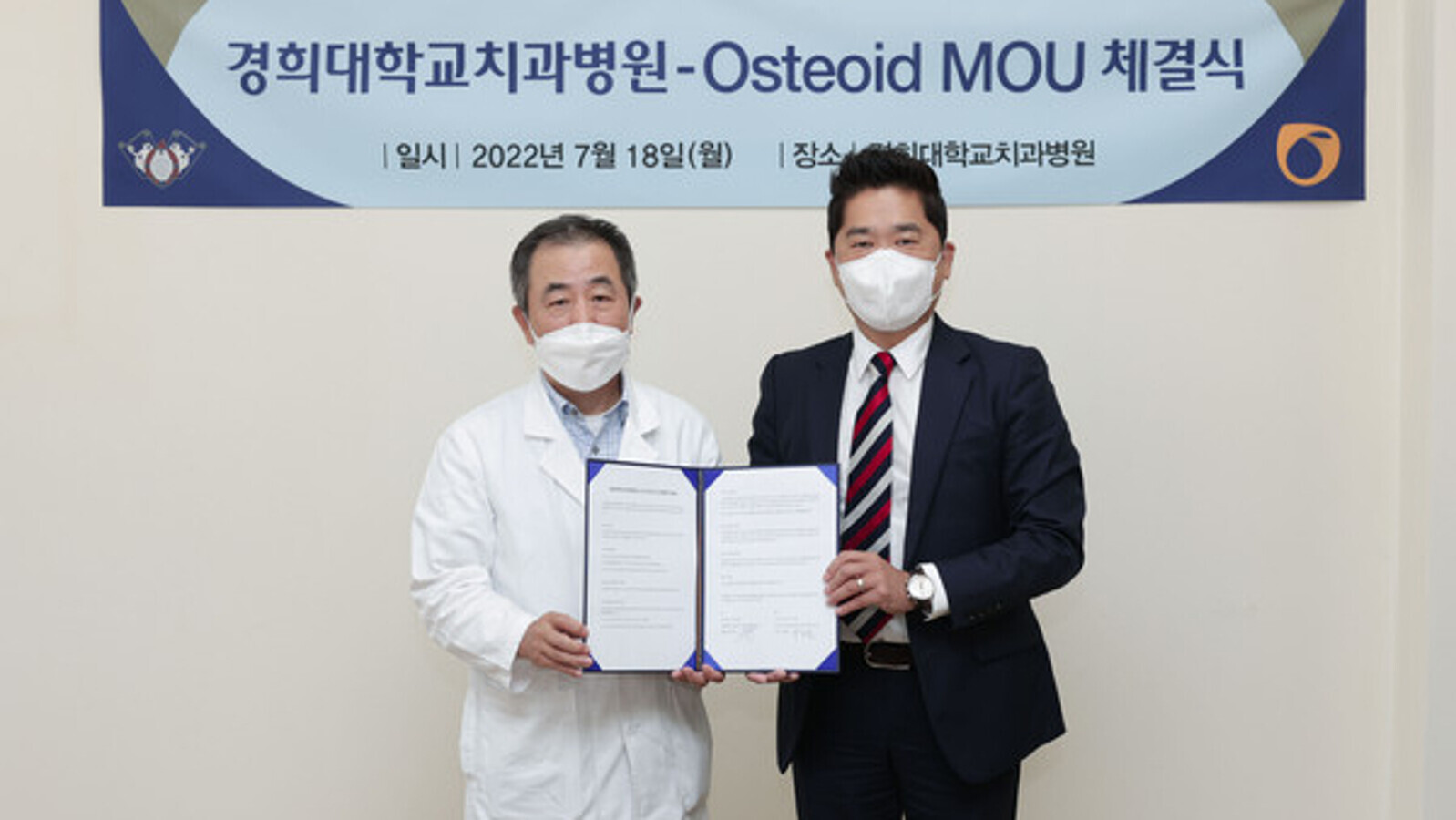 De gauche à droite : Le professeur Hwang Eui-Hwan, directeur de l'hôpital dentaire de l'université Kyung Hee, et le Dr Calvin Hur, p-dg d'Osteoid. (Photo : Korea Biomedical Review)