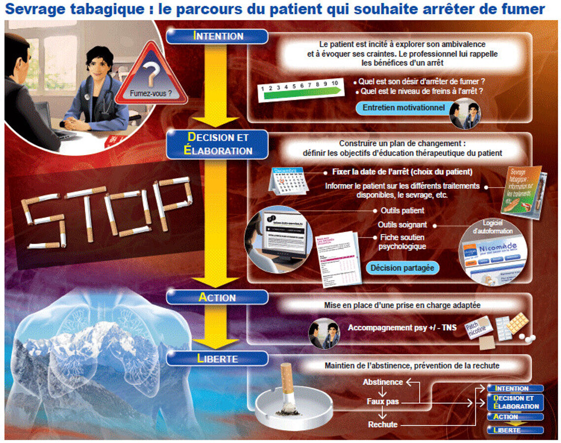il continue à fumer malgré les conséquences tangibles sur sa santé (infarctus, BPCO, cancer...) ou les risques encourus dans certaines situations spécifiques (intervention chirurgicale, grossesse…) ;