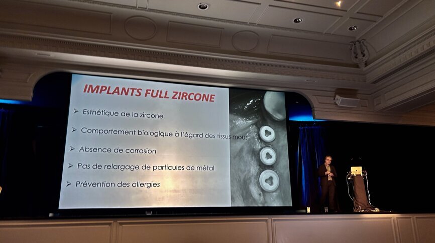Dr Fabrice Baudot a exposé lui aussi sur la zircone et son rôle clé dans l'ostéointégration, indispensable à la réussite d'une chirurgie implantaire. Il a approfondi la notion d'immuno-intégration des implants, essentielle pour prévenir les péri-implantites. Grâce à ses caractéristiques et propriétés biologiques, la zircone offre des solutions prothétiques qui se rapprochent des dents naturelles et sont à la fois ostéo et immuno-intégrées. Comme en a parlé le Dr Gallizia, n’ayant pas d’allergies aux métaux connues, la zircone représente une alternative pour les patients allergiques aux métaux, évitant les réactions telles que les lésions cutanées, dont le lien avec la présence de métaux dans la cavité buccale est rarement considéré. Sa moindre rétention de plaque et son comportement proche des dents naturelles la rendent optimale pour le travail prothétique.
