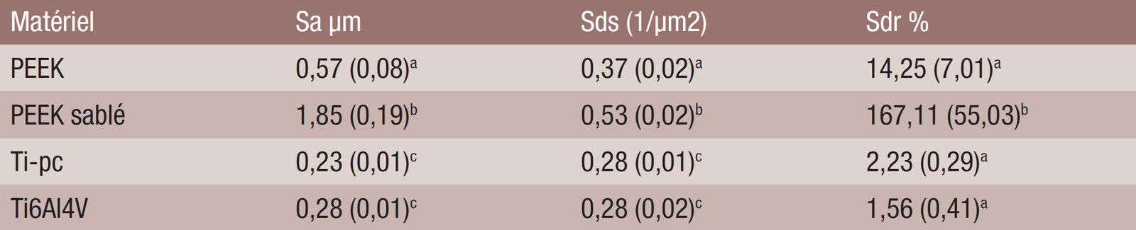 Les résultats des mesures de la topographie de surface sont présents dans le Tableau1. La surface du PEEK sable était sensiblement plus rugueuse et tous les paramètres (Sa, Sds, Sdr) affichaient des valeurs moyennes plus élevées que les trois autres surfaces. Les surfaces du Ti-pc et du Ti6Al4V étaient sensiblement plus lisses que celles du PEEK et présentaient des valeurs moyennes de Sa et Sds plus faibles.