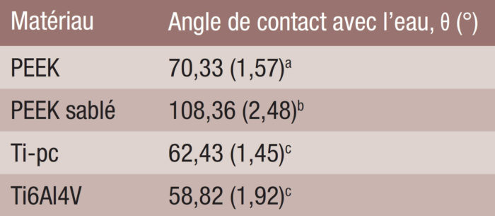 Tableau 3 : Mesures de l’angle de contact pour les différents matériaux. Abréviations : Ti-pc, titane pur commercial ; PEEK, polyétherethercetone ; Ti6Al4V, titane-6 aluminum- 4 vanadium. Angles de contact moyens et leurs écarts-types entre la goutte de liquide et la surface solide (°). N = 3. Les valeurs moyennes n’ayant pas le même exposant sont sensiblement différentes – calcul effectué par une analyse de la variance à un facteur, suivie d’un test post hoc de Tukey, niveau de signification fixe a p < 0,05.
