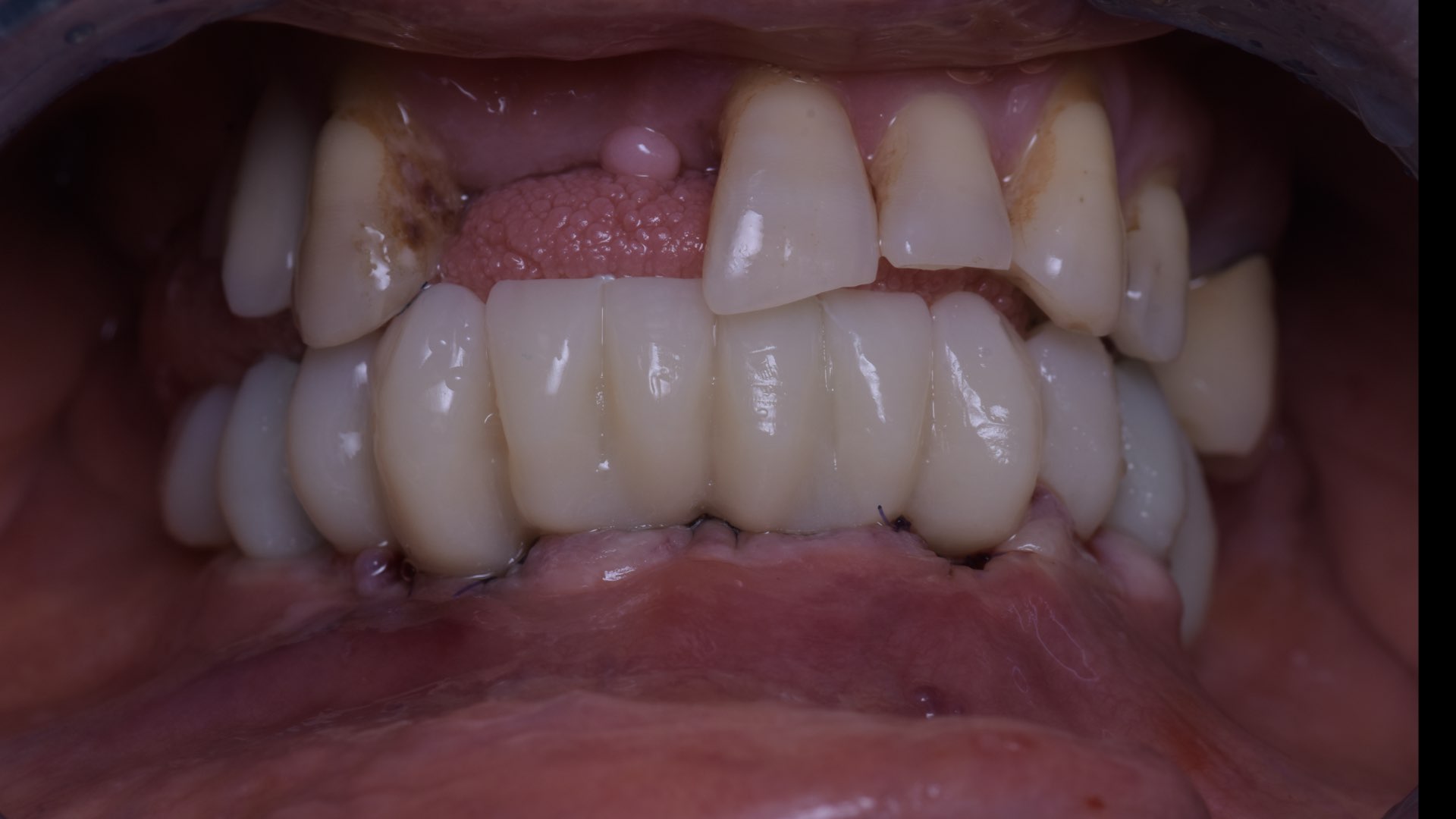 À ce stade-là (Fig. 13), les particules de comblement de GTO (comblement xénogénique), utilisées afin de combler les alvéoles maxillaires, sont encore présentes dans l’épaisseur gingival car elles ne sont pas encore intégrées aux tissus mous, mais la mise en condition gingivale guidée par le design et la compression du bridge provisoire, permettent déjà un aménagement idéal pour la réalisation de la prothèse définitive à venir.