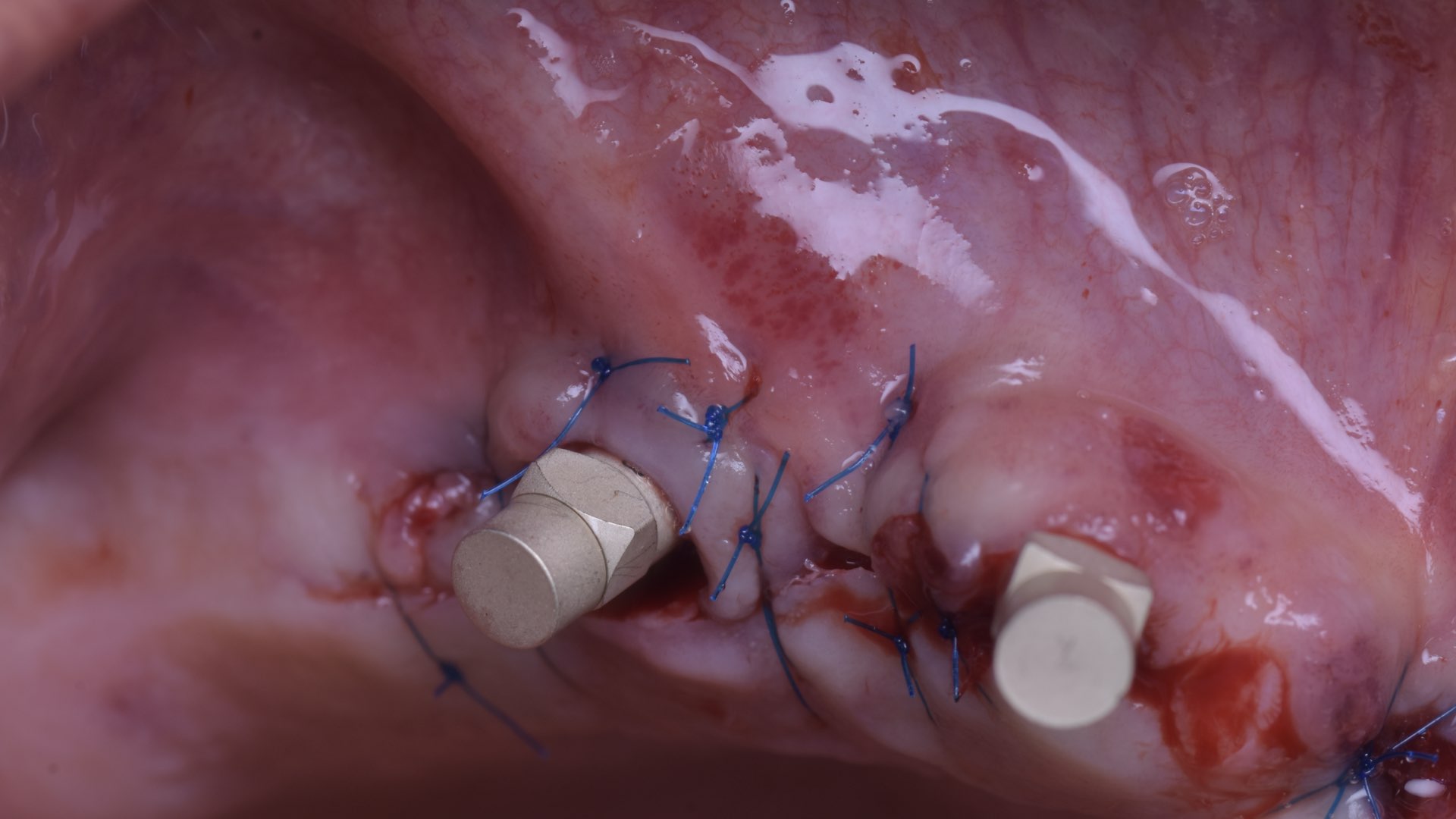 Les deux implants antérieurs seront tout d’abord posés afin de respecter un positionnement idéal pour un futur vissage palatin de la prothèse, puis les deux implants postérieurs seront inclinés à 20 degrés (protocole classique décrit par le Dr Malo).4 Ensuite des piliers coniques multi-unit droits en antérieur et de 17 degrés en postérieurs, sont vissés sur nos implants. Enfin les scan bodies sont placés avant les sutures, afin d’assurer un contrôle visuel de leur bonne position, ainsi qu’une bonne adaptation.