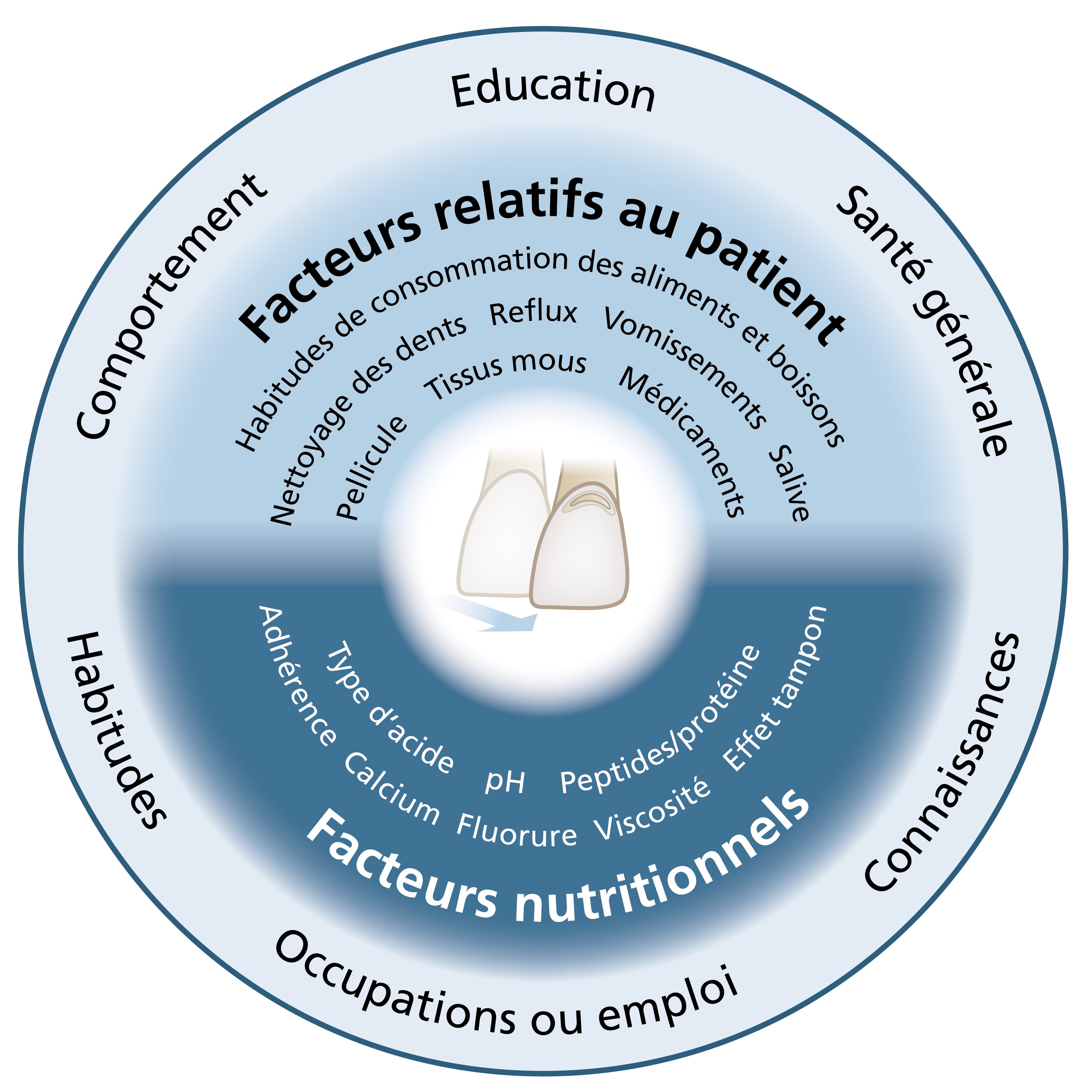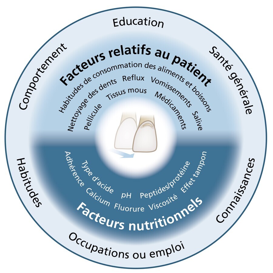 La valeur du pH d'une boisson ou d'un aliment n'est pas le seul facteur décisif, car d'autres éléments participent au potentiel érosif (Fig. 1). Ainsi, de nombreux aliments et boissons acides (p. ex. pH 4), ne provoquent pas une érosion. Pourquoi ?