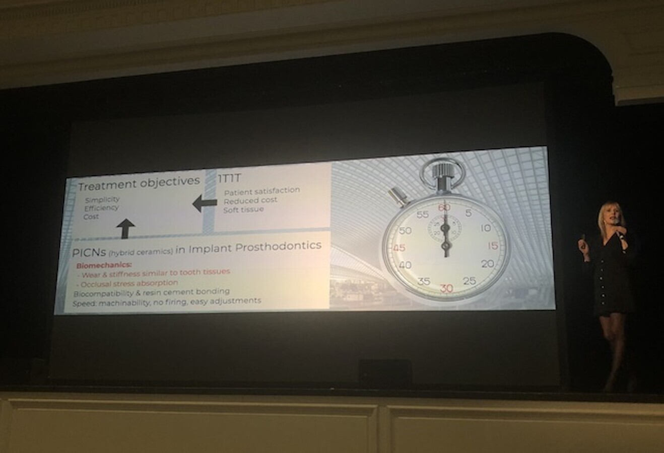 Dr Amélie Manjot dans sa présentation « One tooth – One time » (1T1T), ou la mise en charge immédiate des implants unitaires postérieurs avec la couronne définitive, a parlé de l’avènement des technologies numériques et de l’apparition des composites CFAO, et en particulier des PICNs (céramiques hybrides), permettant de mettre en œuvre des nouvelles stratégies thérapeutiques sur dents et sur implants. Elle a présenté un protocole naît du développement de nouveaux biomatériaux, basé sur un concept biomécanique découlant de ce développement.