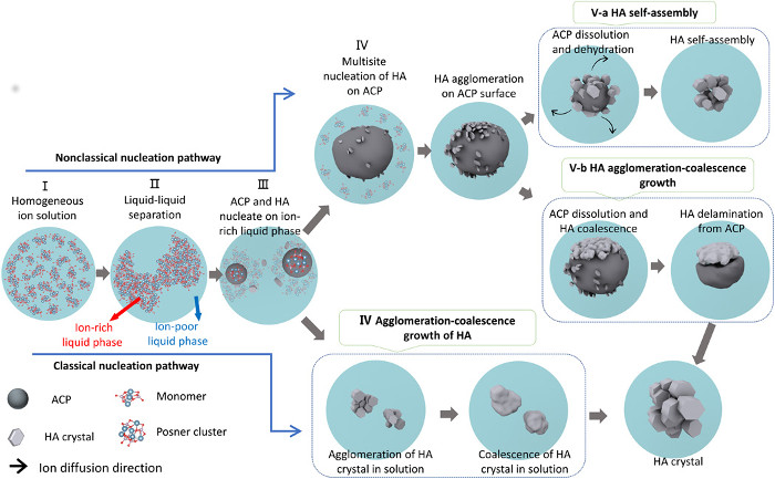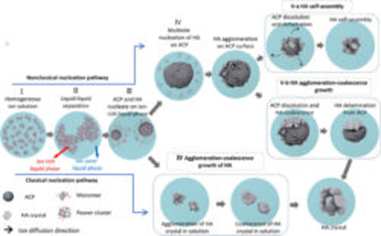 Représentation schématique des voies de cristallisation de l'hydroxyapatite. (Image : He et al.)