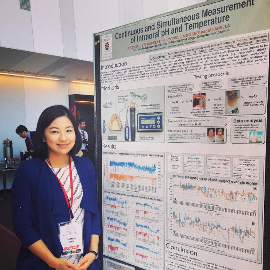 Le Dr Joanne Choi concourt à la session d'affiches Colgate Australie/Nouvelle-Zélande 2014 de la conférence de l'Association internationale pour la recherche dentaire à Brisbane en Australie avec sa recherche de doctorat. (Photo : Joanne Choi)