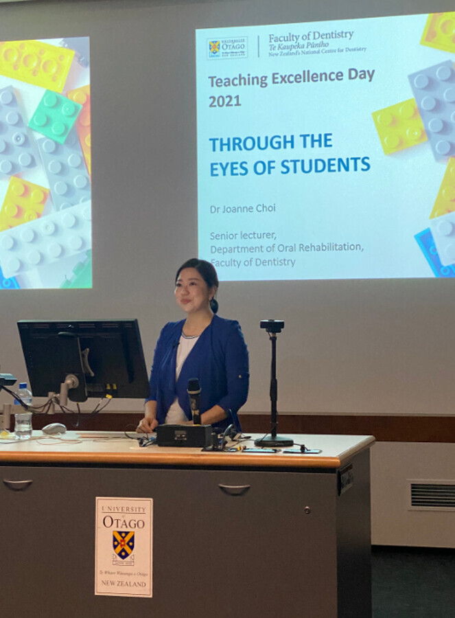 Le Dr Joanne Choi donne une conférence lors de la Journée d'excellence de l'enseignement 2021 à l'Université d'Otago. (Photo : Joanne Choi)