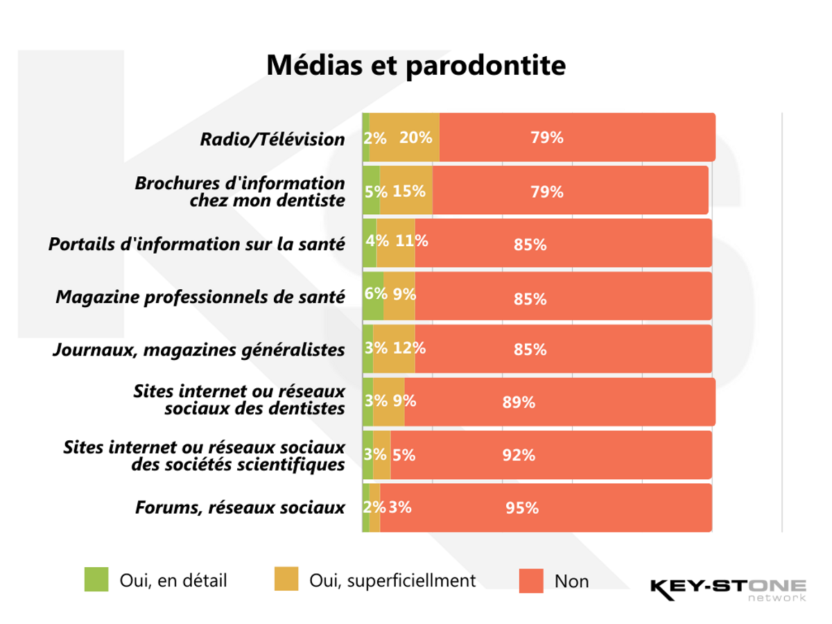 La recherche internationale montre également l'importance des canaux de communication liés à la connaissance de la parodontite, à travers la question suivante : « Avez-vous déjà entendu parler de la parodontite dans les médias suivants ? ». En particulier, en France, les médias de masse (radio et télévision) et les brochures d'information dans les cabinets dentaires sont les plus pertinents. Cependant, de manière générale, il semble que l'on parle assez peu de parodontologie dans les médias, ce qui pourrait expliquer en partie la connaissance limitée de cette maladie.