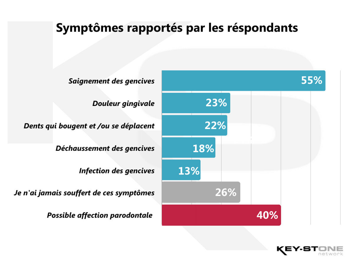 Le résultat le plus surprenant est que 47 % de la population adulte européenne interrogée ne connaît pas la parodontite. Dans l'ensemble, il s'agit d'une donnée préoccupante, surtout si l'on considère l'incidence élevée de cette pathologie dont souffrirait, selon les études épidémiologiques, environ 40 % de la population adulte occidentale présentant des symptômes cliniques, tandis que plus de 10 % manifestent des formes graves.