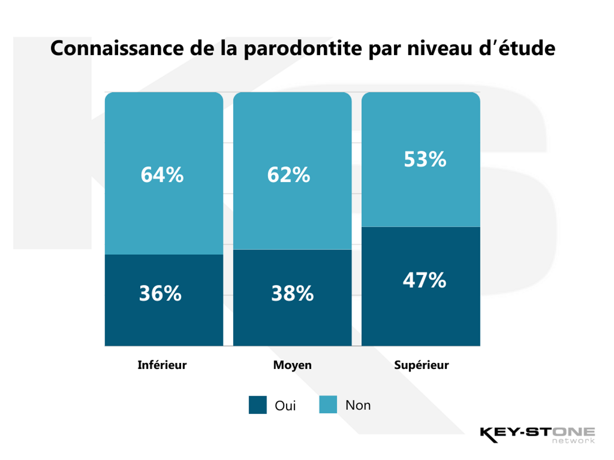 En se concentrant sur la France et en examinant plus en détail les résultats, la différence de connaissance de la parodontite en fonction du niveau d'éducation des personnes interrogées est assez évidente (près de 50 % de connaissances parmi les diplômés). En revanche, les aspects économiques liés au revenu familial et les aspects démographiques sont moins pertinents, à l'exception d'une meilleure connaissance de la maladie chez les personnes de plus de 65 ans (à hauteur de 55 %).