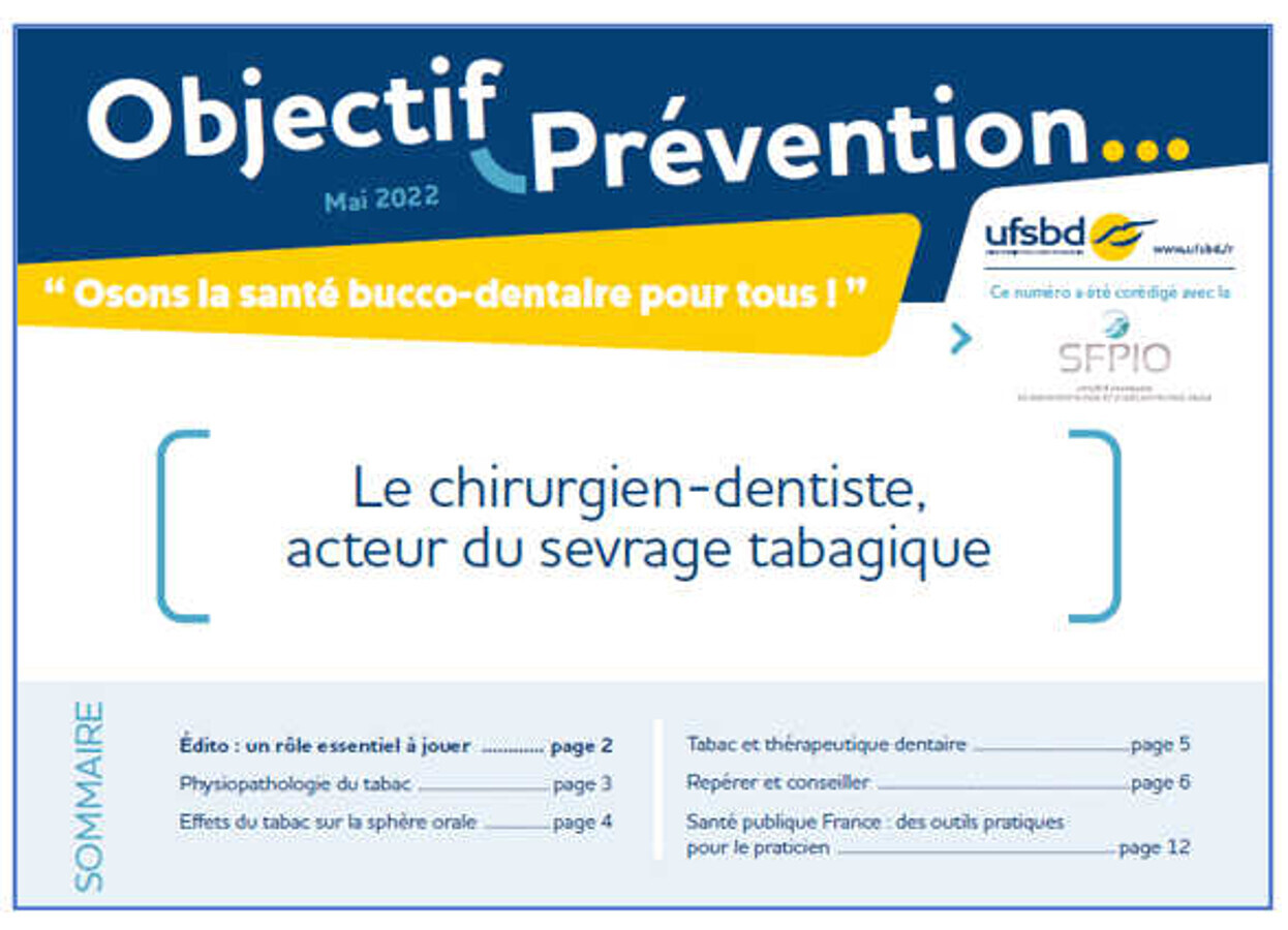 Le numéro Objectif Prévention : Le chirurgien-dentiste acteur du sevragetabagique, dédié à l’accompagnement de l’arrêt du tabac est disponible sur le site ufsbd.fr-Espace Pro. Complet, ce document explique en pratique aux chirurgiens-dentistes comment accompagner un patient à l’arrêt de la consommation de tabac, et les guide dans la démarche et la prescription de TSN.