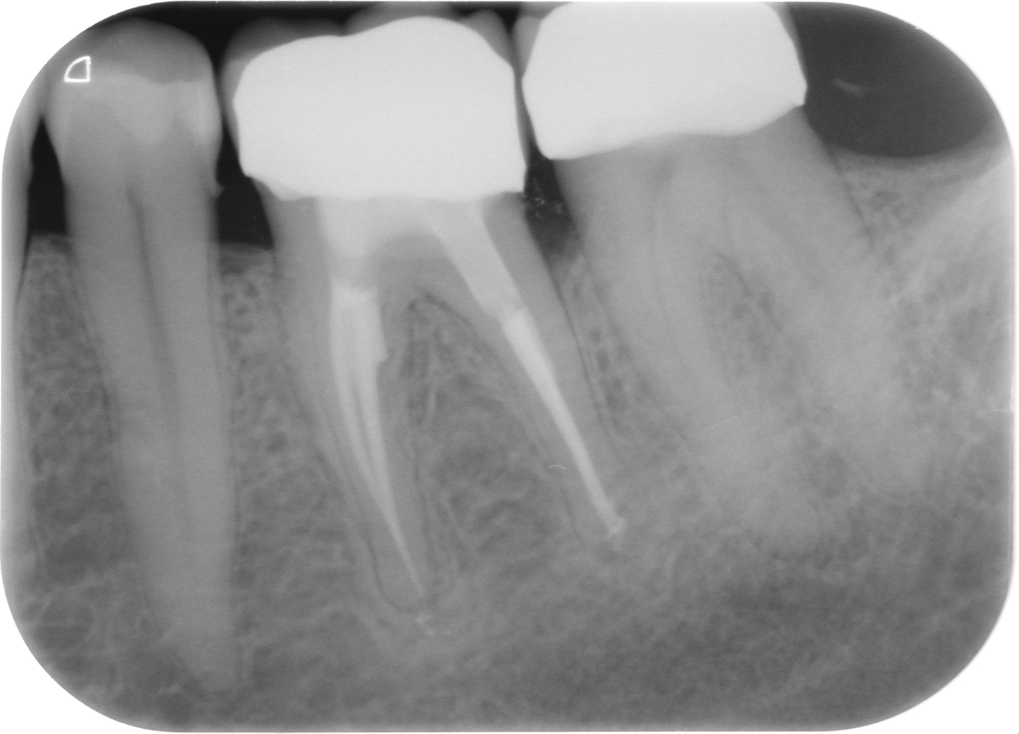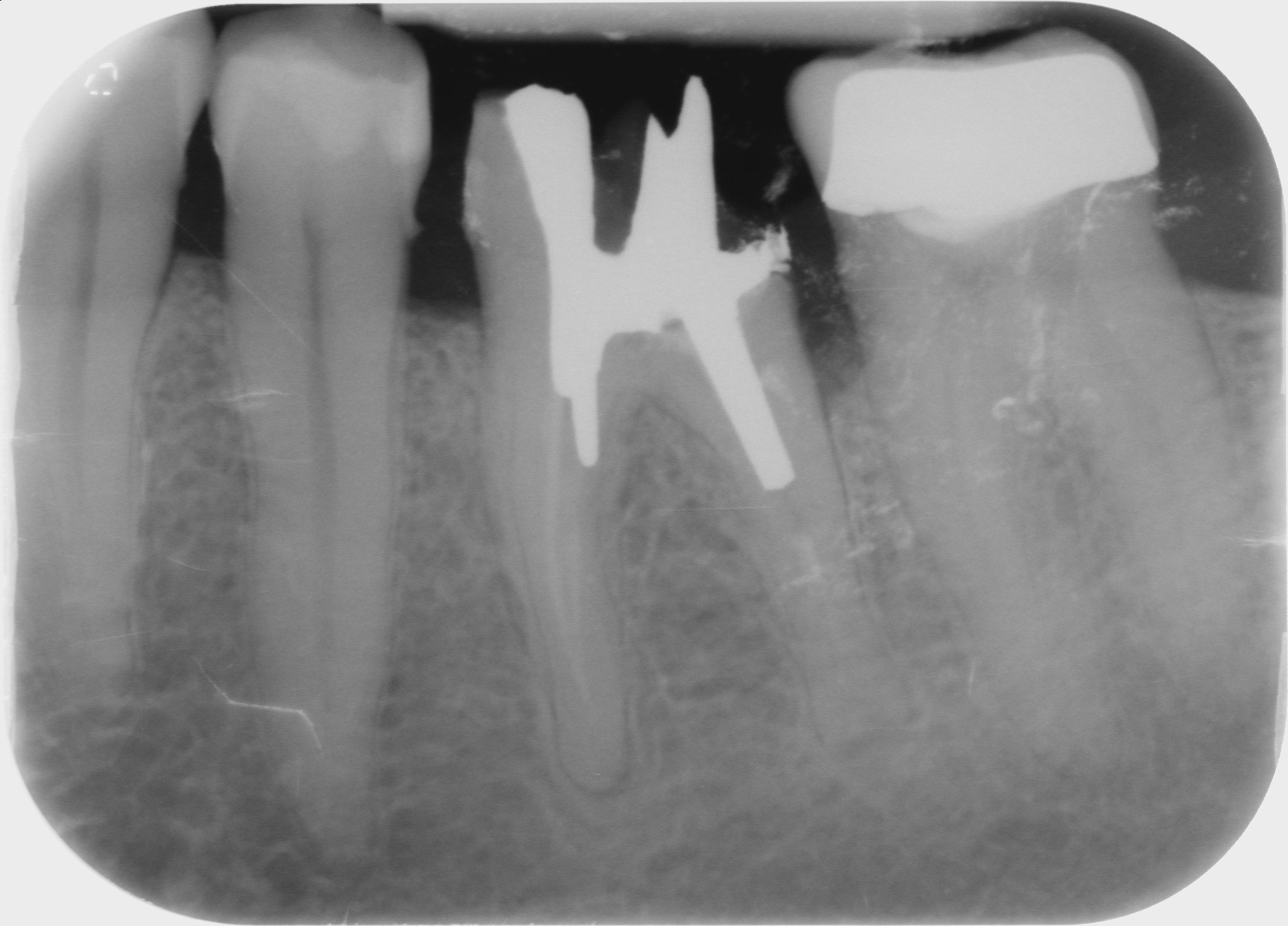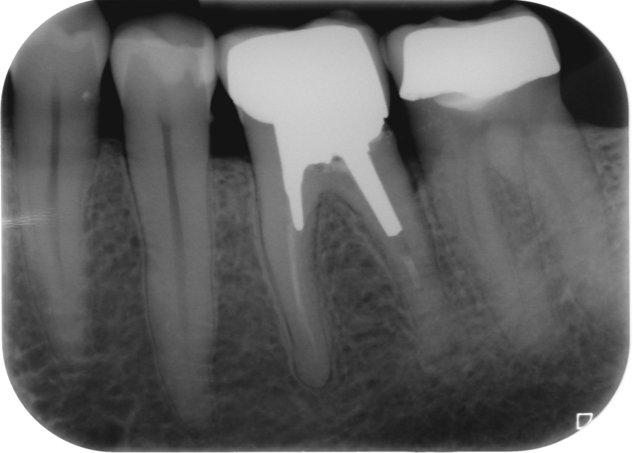 Fig. 1 : Radiographie préopératoire montrant la présence d’une reconstitution corono-radiculaire coulée, ancrée dans les trois canaux.