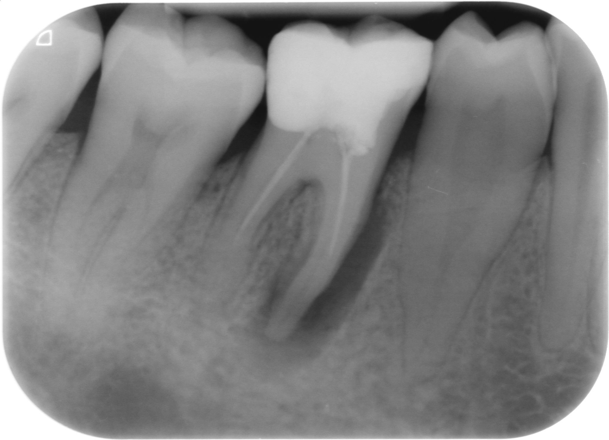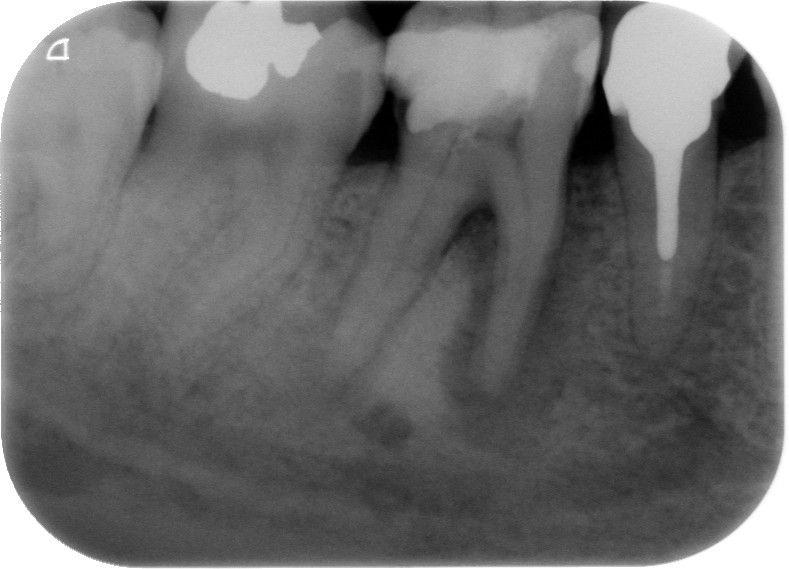 Fig. 1 : Radiographie préopératoire montrant la présence d’une reconstitution corono-radiculaire coulée, ancrée dans les trois canaux.