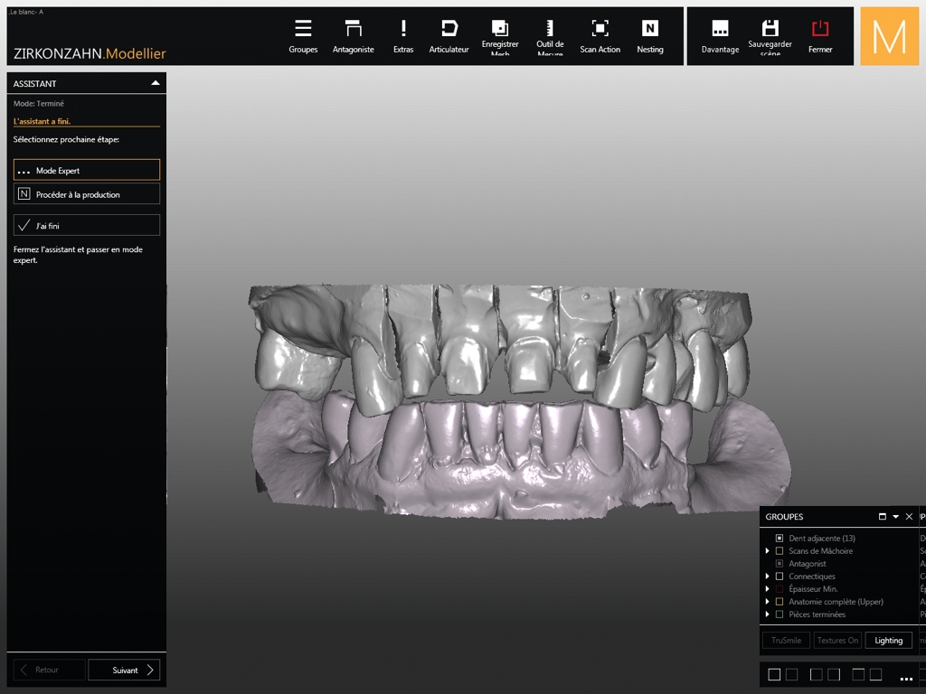 Cinq jours plus tôt, la figure 7 montre le modèle virtuel après l’étape de scan numérique (logiciel Zirkonzahn. Scan). Le logiciel va permettre de numériser des modèles physiques pour les importer dans la suite logicielle. Les modèles numériques sont alors montés en occlusion avec un articulateur virtuel. Les limites de préparation sont tracées, et grâce au détourage préalable, chaque dent préparée peut être individualisée, pour passer à l’étape suivante de modélisation de la couronne.
