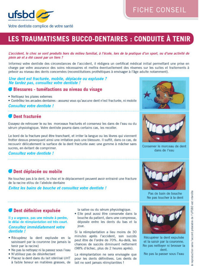 PARIS, France : Dix à quinze pour cent de tous les accidents dentaires surviennent lorsque l’on pratique un sport. Le risque est réduit pour les personnes disposant d’un protège dents. Mais il importe d’agir rapidement si, malgré tout, une dent est cassée. Une boîte de secours dentaire permet de préserver la dent brisée pendant plusieurs heures, ce qui augmente les chances de la remettre en place avec succès par son dentiste. Consultez les fiches conseils de l’Union française pour la santé bucco-dentaire (UFSBD) éditées sur le sujet.