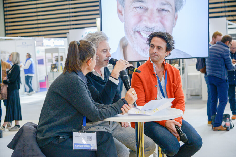 De gauche à droite, Dr Benjamin Évieux, co-président d'Aria Digital, Marylin Michel, chargée de mission à l'UFSBD, et Dr François Perrier, président de l'UFSBD. (Photo : Cécile Bouchayer)