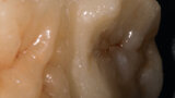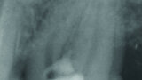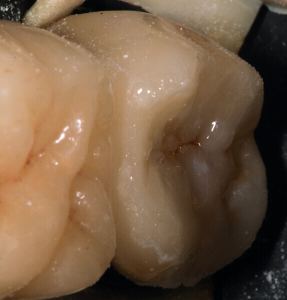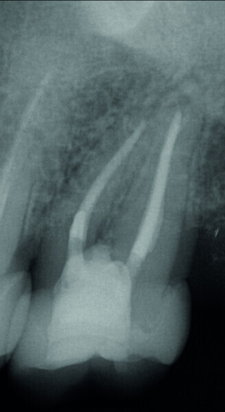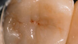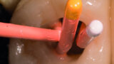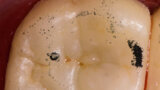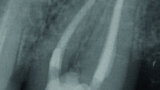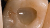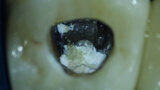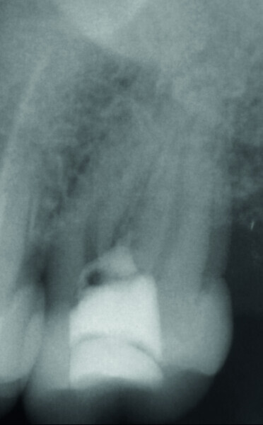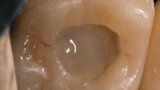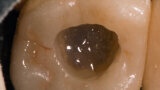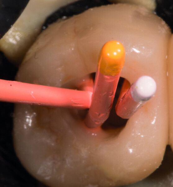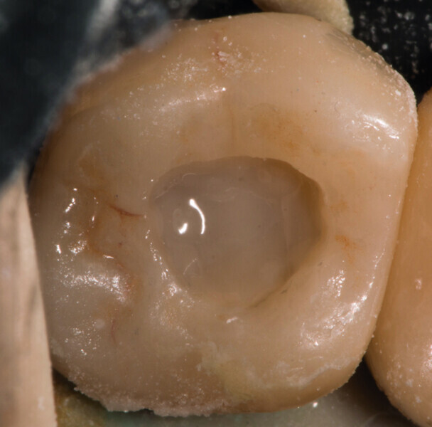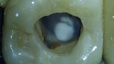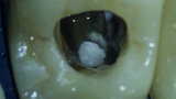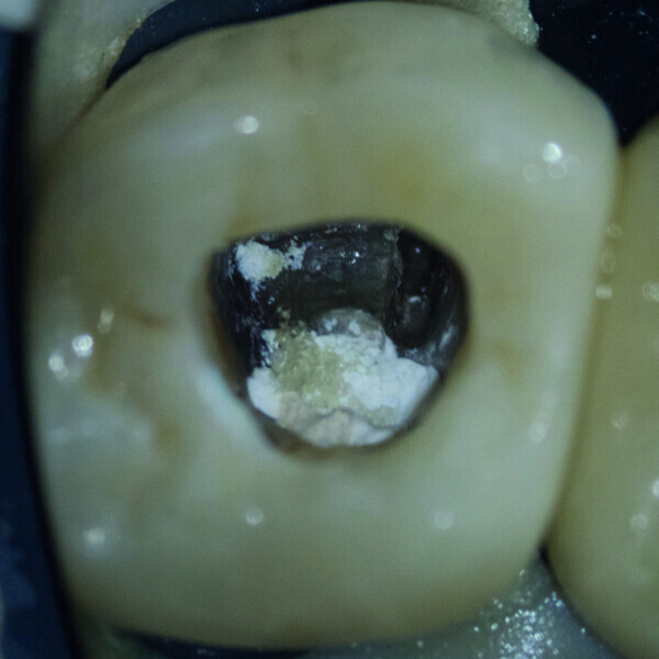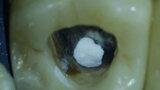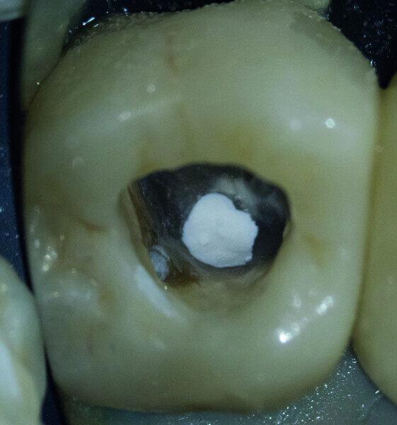 Fig. 4 : L’orifice a été provisoirement fermé avec un matériau d’obturation hygroscopique provisoire et recouvert d’un composite fluide de couleur bleue.