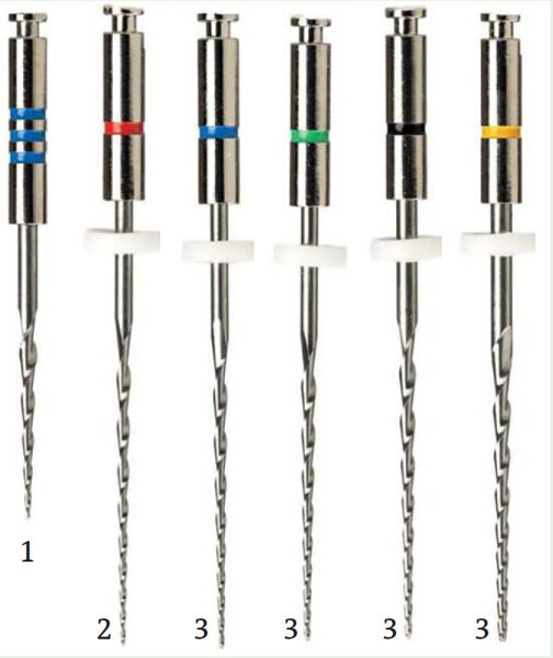 2. Une lime n° 25.04 pour la préparation initiale jusqu’à’a la longueur de travail obtenue après exploration a l’aide de limes K manuelles jusqu’au numéro 15. Pour être utiliser de préférence en réciprocité, 90/30°,350 rpms.