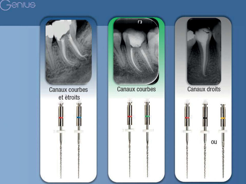 Fig. 7 : les différentes limes du système Genius et séquences utilisées en fonction de du profil radiculaire (c Dr Carlos Spironell Ramos).